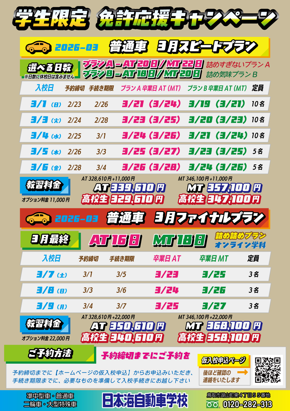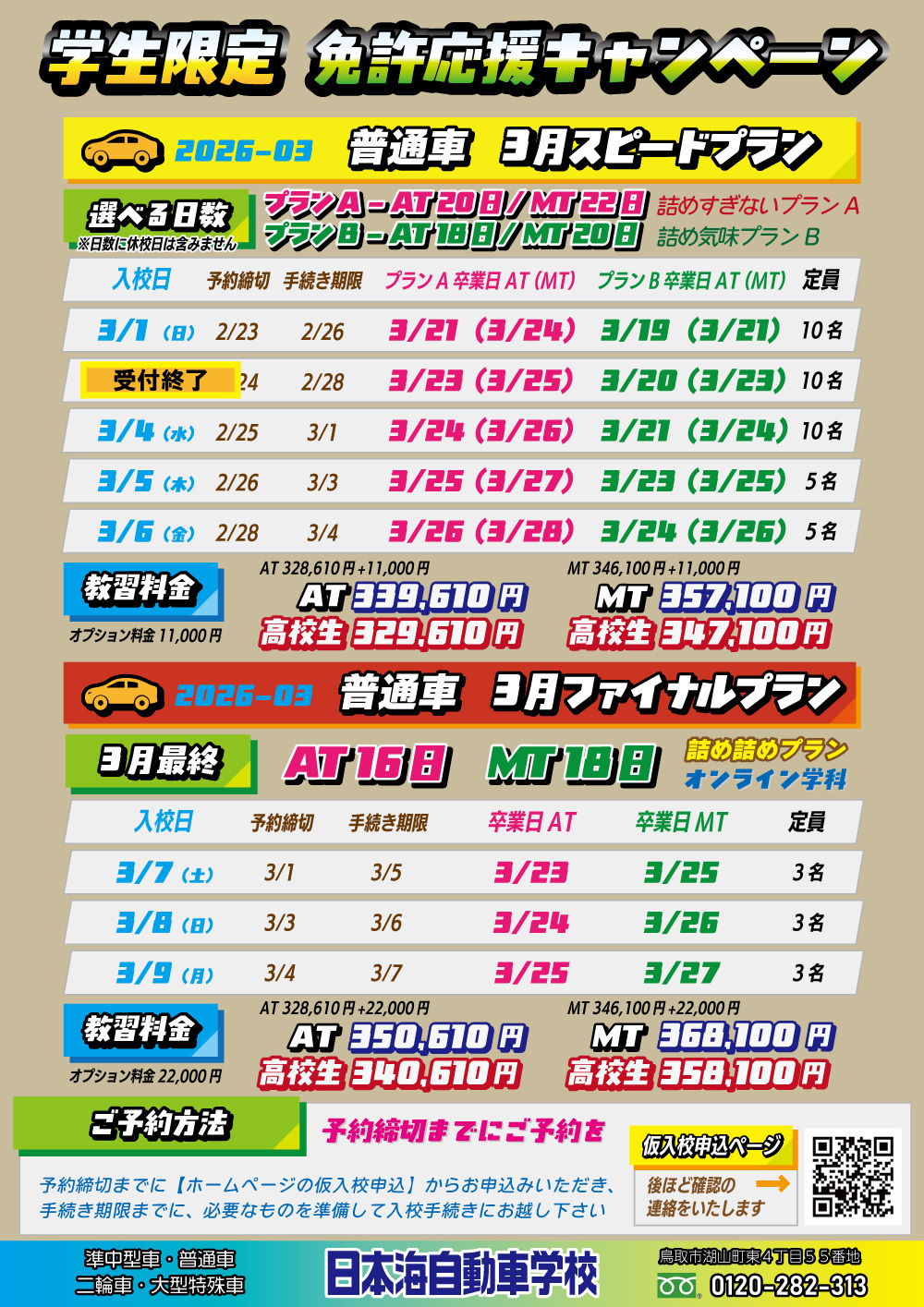 🏫学生限定の🚙普通車2026年3月入校で3月卒業可能なプランです
